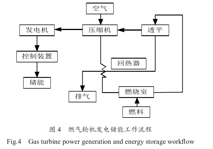 燃?xì)廨啓C(jī)發(fā)電儲(chǔ)能是通過(guò)燃料供給系統(tǒng)將天然氣輸送到燃燒室。天然氣在燃燒室內(nèi)與空氣混合燃燒,產(chǎn)生高溫高壓的燃?xì)?。這些高溫高壓的燃?xì)庋杆倥蛎?并流經(jīng)透平葉片, 推動(dòng)透平旋轉(zhuǎn)。透平葉片通過(guò)軸連接到發(fā)電機(jī),透平的旋轉(zhuǎn)帶動(dòng)發(fā)電機(jī)的轉(zhuǎn)子旋轉(zhuǎn),從而在定子中產(chǎn)生電流,完成電能的轉(zhuǎn)換。最終將電能儲(chǔ)存到儲(chǔ)能系統(tǒng)中,以便在電力需求高峰期或電網(wǎng)出現(xiàn)故障時(shí)進(jìn)行釋放和使用。如圖4所示。在燃?xì)廨啓C(jī)發(fā)電儲(chǔ)能過(guò)程中,儲(chǔ)能系統(tǒng)可以幫助平衡燃?xì)廨啓C(jī)發(fā)電的輸出波動(dòng)。燃?xì)廨啓C(jī)的啟動(dòng)和停止時(shí)間較長(zhǎng),且燃料燃燒效率和發(fā)電效率容易受環(huán)境溫度和負(fù)荷變化的影響。通過(guò)儲(chǔ)能系統(tǒng)的調(diào)節(jié),可以在短時(shí)間內(nèi)補(bǔ)償輸出功率的波動(dòng),確保電網(wǎng)的穩(wěn)定運(yùn)行。在負(fù)荷較低時(shí),燃?xì)廨啓C(jī)的效率較低, 部分燃料會(huì)被浪費(fèi)。儲(chǔ)能系統(tǒng)可以在這種情況下存儲(chǔ)多余的電能,并在電力需求高峰期釋放,減少燃?xì)廨啓C(jī)的啟動(dòng)和停止次數(shù),從而提高整體的能源利用效率。