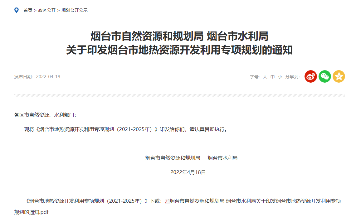 地大熱能地熱+多能互補新聞網訊:近日,煙臺市自然資源和規(guī)劃局、煙臺市水利局聯合印發(fā)了《煙臺市地熱資源開發(fā)利用專項規(guī)劃(2021-2025年)》(以下簡稱《規(guī)劃》)。