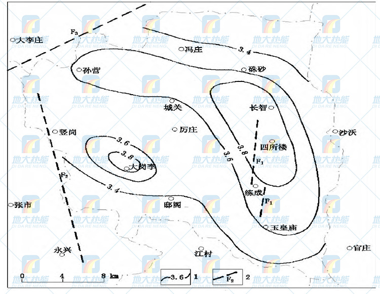 根據(jù)地溫梯度計算, 500 m埋深地溫變化范圍32~35℃, 1000 m埋深地溫變化范圍48~54℃。500 m埋深大于34℃的高溫區(qū)及1000 m埋深大于52℃的高溫區(qū)主要分布在長智-四所樓-練成-玉皇廟及大崗李一帶。地溫垂向上隨地層深度增加而增大, 300~500m深度為25~35℃;500~700 m深度為31~40℃;700~1000 m深度為40~53℃;推算1400 m深度地溫達60℃左右。