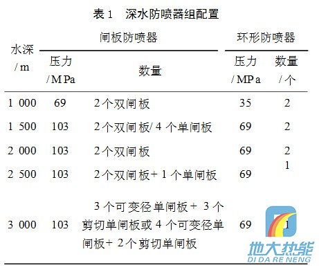 水下防噴器是海洋石油鉆采過程中用于防止井噴發(fā)生的專用設(shè)備,上部連接隔水管裝置,下部連接海底井口裝置。深水防噴器組通常有5個閘板和2個萬能防噴器組成,第5個閘板即底閘板可以剪斷套管,套管剪切閘板位于盲板的下部,以便在剪斷套管后可以關(guān)井,通常在套管可能遇卡或者鉆井裝置需要應(yīng)急脫離時會用到。2個萬能防噴器是冗余設(shè)計的需要,上部萬能防噴器作為井控的主要手段。根據(jù)水深的不同,深水防噴器組通常有不同的配置。表1是在總結(jié)Transocean公司所有不同水深典型鉆井船防噴器組配置情況得出的,可以作為深水鉆井防噴器組配置的參考。 對于浮式鉆井裝置(半潛式平臺或鉆井船),選用防噴器系統(tǒng)的通徑為?476.3mm(工作水深<600m)或?425.5mm(工作水深>600m),選用封井壓力為69、103、138MPa時,視工作水深、海底至目的層深度和是否為特殊高壓的油氣層而定。為了適應(yīng)欠平衡鉆井的需要,井口防噴器組合要配置高壓旋轉(zhuǎn)防噴器,即隨鉆壓力控制系統(tǒng)PCWD(Pres2sureControlWhileDrilling)。