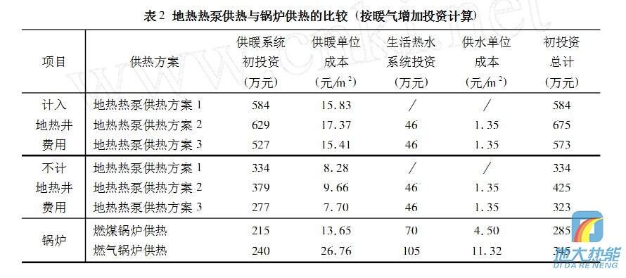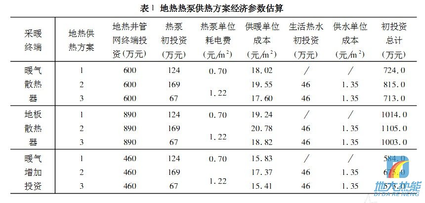 表1列出了不同采暖終端,新鉆地熱井系統的投資和單位運行成本的計算結果。從三種地熱供熱方案看,方案1的投資低,供暖成本也低,但沒有生活熱水供應。綜合比較,方案3既有供暖,又有生活熱水供應,同時還兼顧夏季空調,運行成本最低,投資費用處在方案1和方案2之間,可作為優(yōu)選方案。